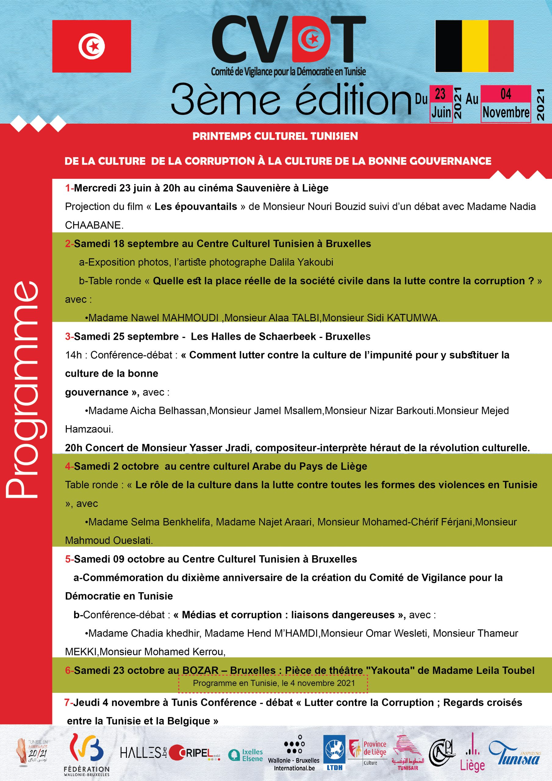 تنظم لجنة اليقظة من أجل الديمقراطية في تونس النسخة الثالثة من الربيع الثقافي التونسي في بلجيكا وتونس حول موضوع « من ثقافة الفساد إلى ثقافة الحكم الرشيد » ، في الفترة من 23 يونيو إلى 23 أكتوبر 2021. ولهذا الغرض يهم اللجنة اعداد ندوة صحفية يوم الخميس 12 أوت على الساعة 10.30 صباحا للإعلان عن هذه التظاهرة بكل تفاصيلها وبرنامجها.
