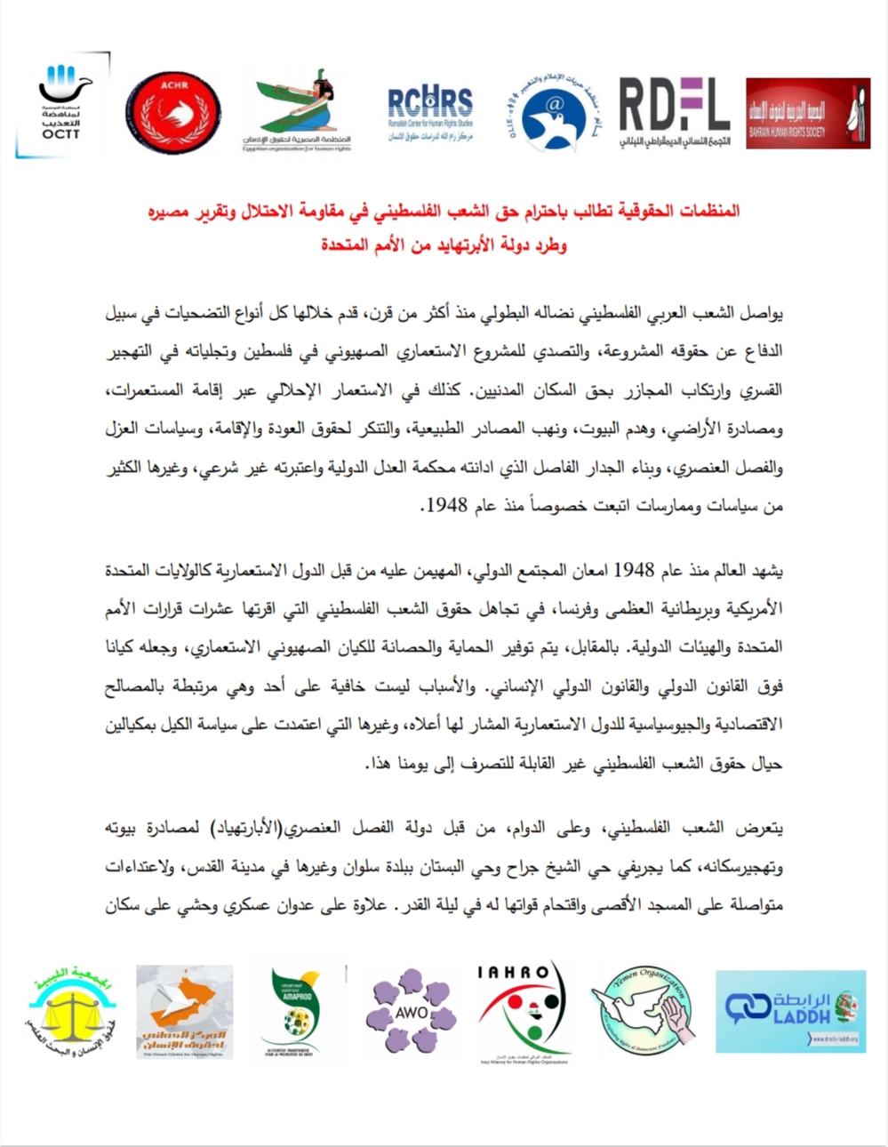 - المنظمات الحقوقية تطالب باحترام حق الشعب الفلسطيني في مقاومة الاحتلال وتقرير مصيره وطرد دولة الأبرتهايد من الأمم المتحدة