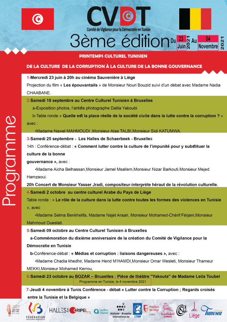 تنظم لجنة اليقظة من أجل الديمقراطية في تونس النسخ الثالثة من الربيع الثقافي التونسي في بلجيكا وتونس حول موضوع « من ثقافة الفساد إلى ثقافة الحكم الرشيد » ، في الفترة من 23 يونيو إلى 23 أكتوبر 2021. ويأتي تنظيم هذه التظاهرة في اطار أنشطة الجمعية السنوية والتي انطلقت منذ سنة 2011 حيث كانت النسخة الأولى تحت عنوان دور الثقافة في مقاومة الإرهاب والنسخة الثانية سنة 2019 تحت عنوان الاليات القانونية والمؤسساتية للحد من ظاهرة الإفلات من العقاب. كما نذكر بأن لجنة اليقظة من أجل الديمقراطية بتونس هي جمعية أحدثت من طرف مجموعة من المواطنين والمواطنات ببلجيكا سنة 2011 وذلك من أجل دعم بناء مسار ديمقراطي في تونس وإرساء دولة القانون والحريات وخلق جسر تواصل بين المهاجرين وأرض الوطن بالإضافة الى التعريف بالتجربة التونسية وفتح افق التفاعل مع الهياكل البلجيكية الرسمية والغير رسمية بما في ذلك جمعيات ونقابات واعلام وغيرها من الفاعلين في الحراك الحقوقي والديمقراطي. ومن أهم المواضيع التي تشتغل عليها الجمعية هي « الهجرة والحق في التنقل وكل الحقوق ذات الصلة ، تعزيز المساواة والدفاع وتكريس حقوق النساء وإرساء دمقراطية من خلال دعم وإرساء المؤسسات الدستورية الهيئات العمومية المستقلة ومن خلال انفاذ القوانين الحث على ضرورة مراجعتها بما يتلائم مع الدستور والمعايير الدولية.