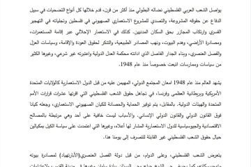 إننا كمثقفين وحقوقيين ودعاة سلام قائم على العدل في العالم العربي، ننطلق من القيم الإنسانية والحقوقية التي نؤمن بها، ويشاطرنا فيها مثقفون وحقوقيون ودعاة سلام من مختلف أنحاء العالم، نخاطبكم، بحكم مسؤولياتكم، لمراجعة قرارات الجمعية العامة السابقة، بما فيها العدول عن إلغاء القرار 3379، الذي يعتبر الصهيونية شكلًا من أشكال العنصرية والتمييز العنصري، واصدار قرار جديد يؤكد هذا المضمون، وما ارتكبته وترتكبه دولة إسرائيل كنظام استعماري كولونيالي من جرائم حرب وعدوان وابادة جماعية وتطهير عرقي وجرائم ضد الإنسانية، لا بد وان يلاحق مرتكبوها ولا يفلتوا من العقاب.