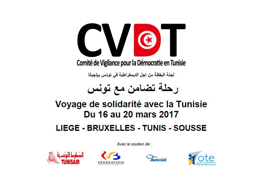 Le CVDTunisie organise pour la seconde fois « Un voyage de Solidarité avec la Tunisie » et ce, du 16 au 20 mars 2017. Des membres de la société civile, des médias audiovisuels et des personnalités belges seront d’ores et déjà du voyage. Nous espérons que l’élan initié par le lancement de cette action se consolidera et se concrétisera une fois encore avec la même énergie.