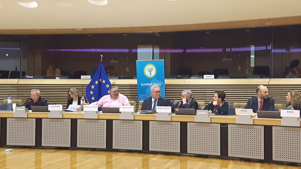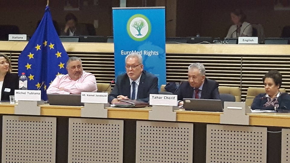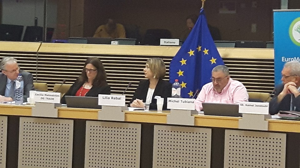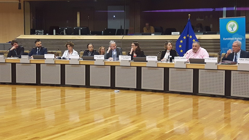 Mobilisation de la société civile pour le suivi des relations entre la Tunisie et l’Union européenne. Avec la participation de Mme Cécilia Malmstrom commissaire européenne au Commerce, Mr Kamel Jendoubi Ministre des relations avec la société civile des instances constitutionnelles et des droits de l’homme, l’ambassadeur de Tunisie à Bruxelles Mr Tahar Cherif, Michel Tubiana président du REMDH Mokhtar Trifi, Fidh, Kacem Afayya, Ugtt, Marc Poulsen, directeur du Remdh Copenhague, Khedija Cherif Atfd, Lilia Rebai REMDH Tunis et plusieurs députés européens, responsables européens et associations (Solidarité Laïque, Programme Concerté Tunisie, Solidar. ..)