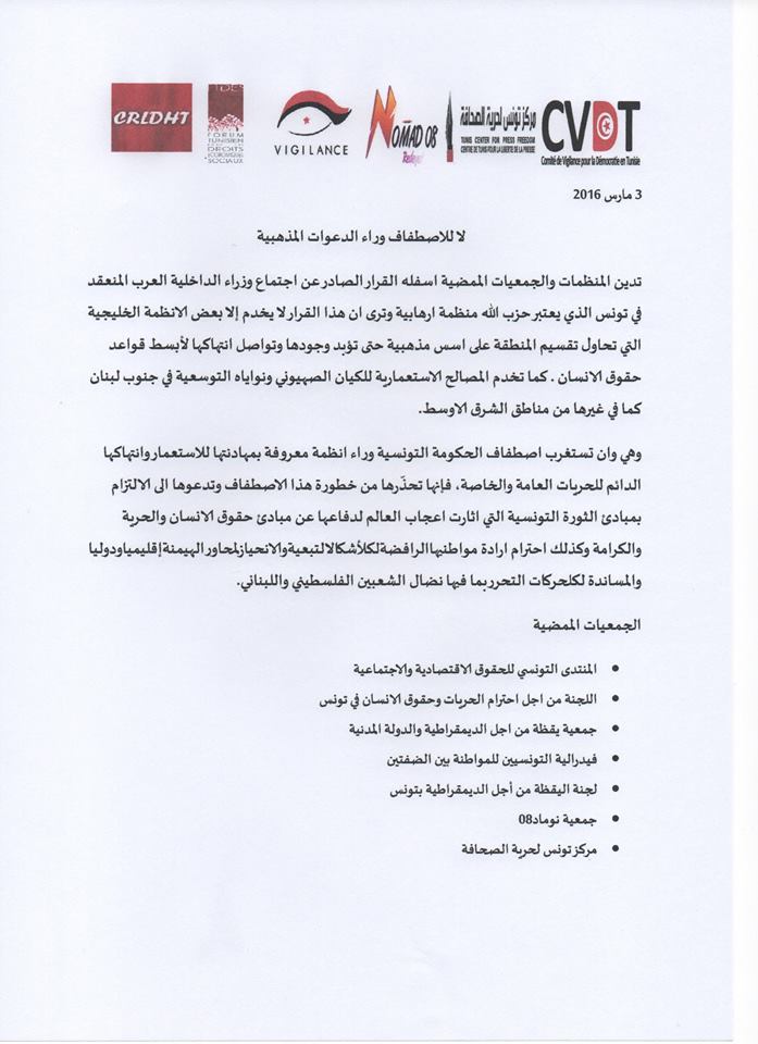 تدين المنظمات والجمعيات الممضية اسفله القرار الصادر عن اجتماع وزراء الداخلية العرب المنعقد في تونس الذي يعتبر حزب الله منظمة ارهابية وترى ان هذا القرار لا يخدم إلا بعض الانظمة الخليجية التي تحاول تقسيم المنطقة على اسس مذهبية حتى تؤبد وجودها وتواصل انتهاكها لأبسط قواعد حقوق الانسان . كما تخدم المصالح الاستعمارية للكيان الصهيوني ونواياه التوسعية في جنوب لبنان كما في غيرها من مناطق الشرق الاوسط.