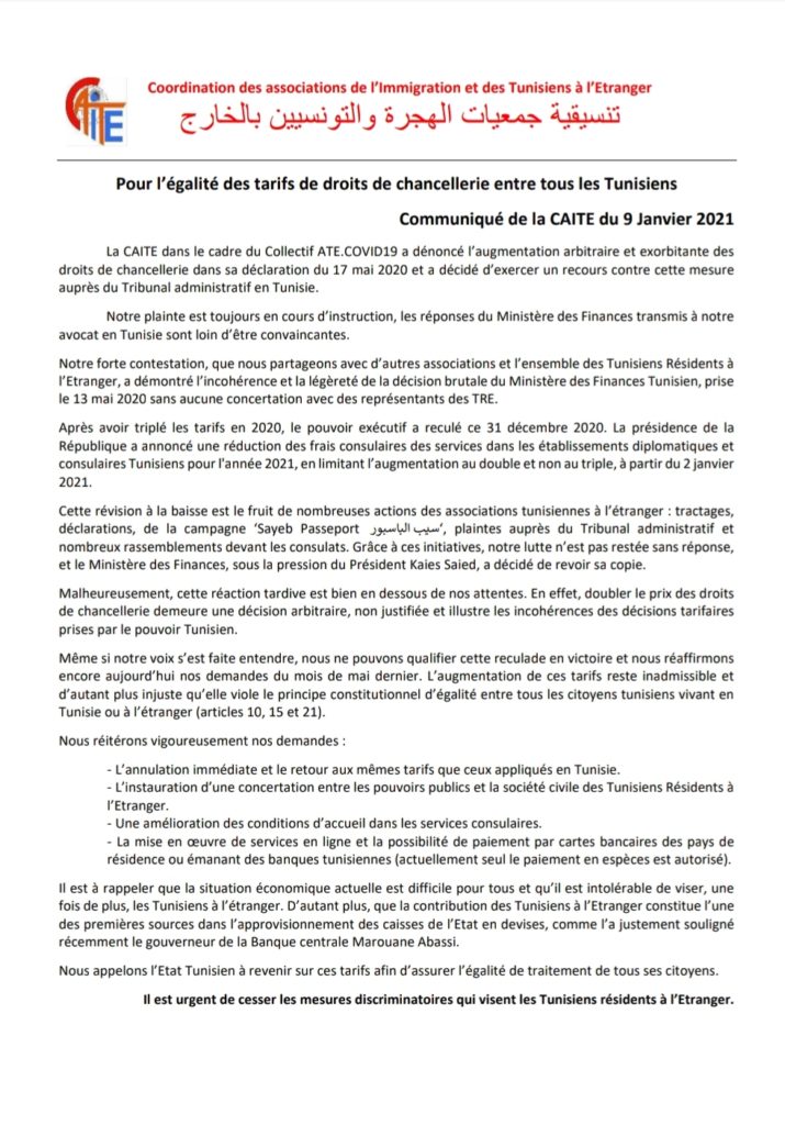 Même si notre voix s’est faite entendre, nous ne pouvons qualifier cette reculade en victoire et nous réaffirmons encore aujourd’hui nos demandes du mois de mai dernier. L’augmentation de ces tarifs reste inadmissible et d’autant plus injuste qu’elle viole le principe constitutionnel d’égalité entre tous les citoyens tunisiens vivant en Tunisie ou à l’étranger (articles 10, 15 et 21).