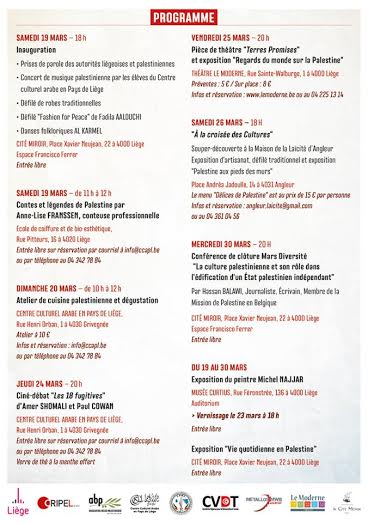 Quinzaine culturelle palestinienne organisée par : ABP- Liège ; CCAPL – asbl ; Communauté palestinienne en Belgique – asbl ; l’échevinat des relations culturelles et interculturelles de la ville de Liège ; Comité de Vigilance pour la Démocratie en Tunisie – asbl; Le monde des possibles -asbl ; In Cité Mondi – asbl, Le Moderne, La Cité Miroir, …Info : liege@abp-wb.be