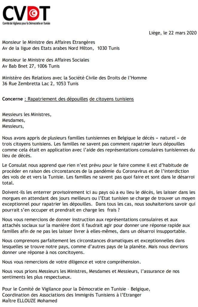 Nous avons appris de plusieurs familles tunisiennes en Belgique le décès « naturel » de trois citoyens tunisiens. Les familles ne savent pas comment rapatrier leurs dépouilles comme cela était en application avec l’aide des représentations consulaires tunisiennes du lieu de décès.